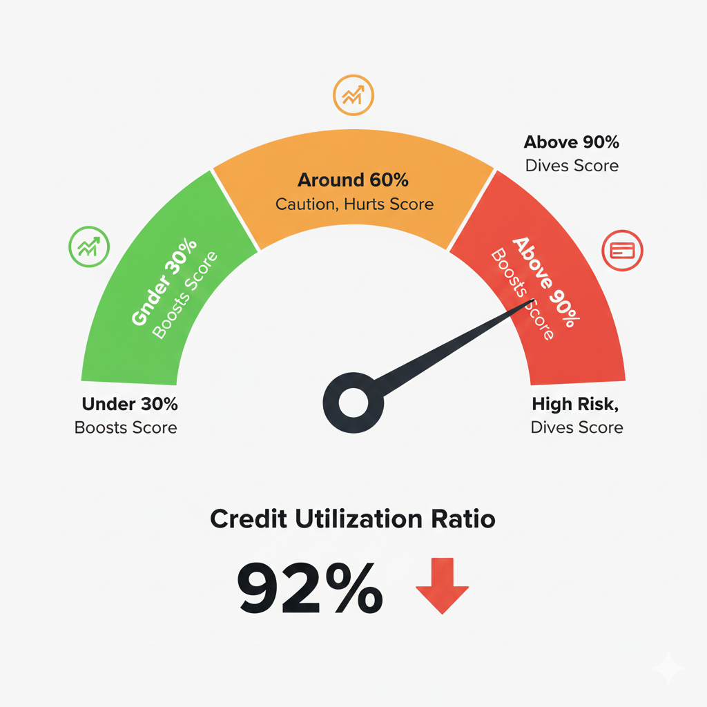 Experts frequently highlight that high utilization above 50 or 60 percent can push your credit score down, while keeping utilization under 30 percent supports healthier scores. (NerdWallet) If you load a big purchase onto a card near its limit, your utilization may jump into the danger zone.