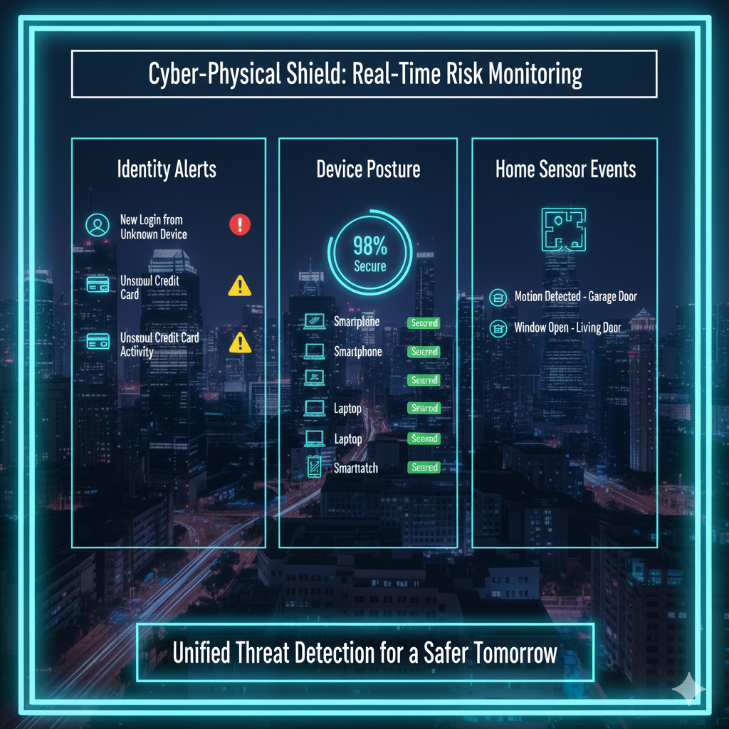 A cyber-physical shield responds by locking accounts, monitoring credit, and coordinating identity restoration. It also advises on home security steps. It might recommend changing smart lock codes. It might recommend camera audit checks.