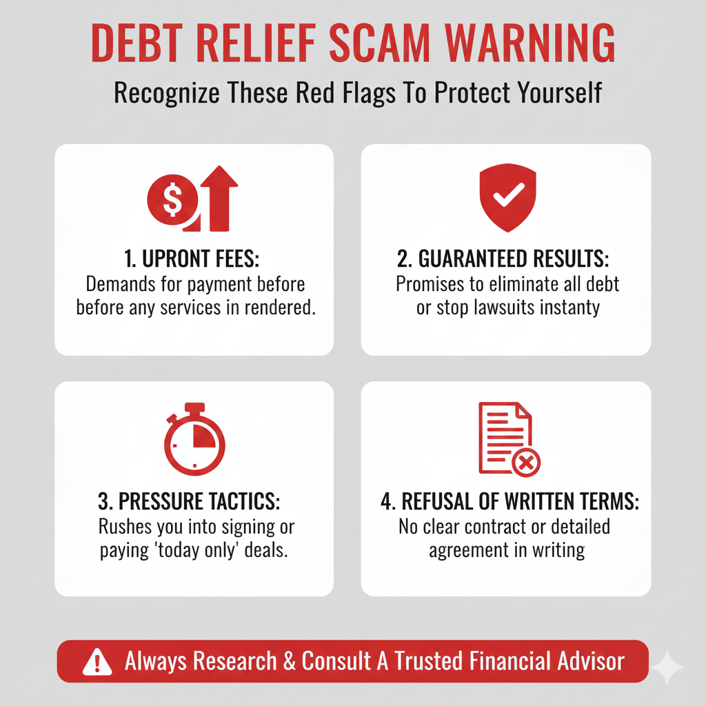 A classic danger sign in debt relief is being asked to pay significant fees upfront for promised results. Regulators have highlighted problems in debt relief markets and rules aimed at preventing abusive practices, including fee-related issues in telemarketing contexts. (Federal Trade Commission)