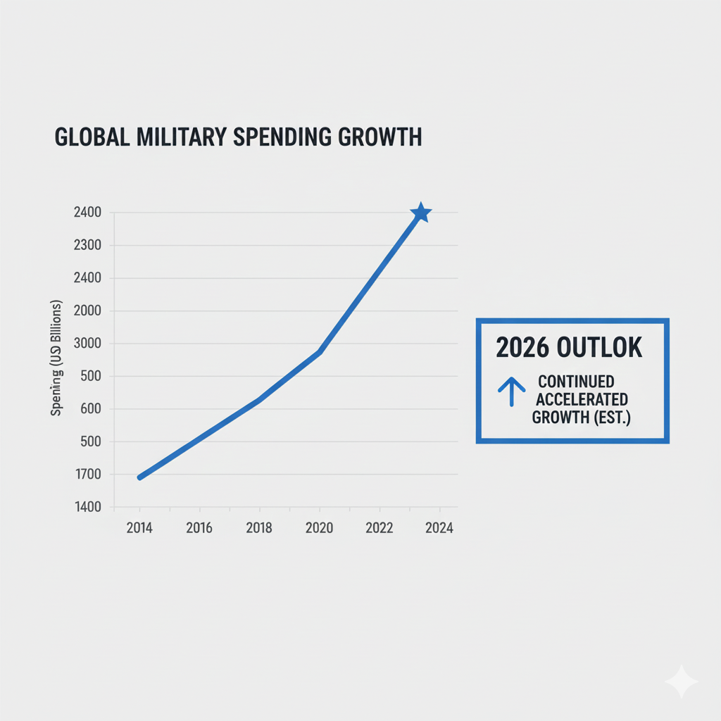 First, spending momentum is real. SIPRI’s 2024 figures show a decade-long climb in global military spending, with a sharp jump in the latest year. (SIPRI) Even if 2026 growth moderates, the baseline level is already massive.
