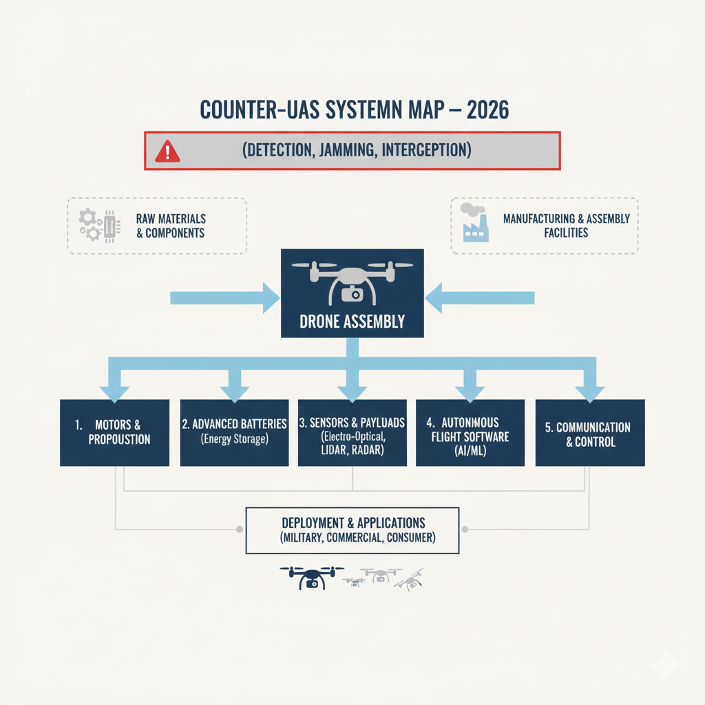 The late-2025 reporting on the U.S. Army’s drone ramp suggests a new procurement mindset: drones as expendable, closer to ammunition than to high-value aircraft. (Reuters) That shift supports a “volume-first” industrial strategy. It also supports a broader ecosystem: components, testing, training, counter-drone systems, and software.
