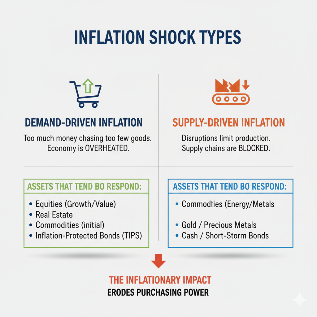 Gold and certain commodities can shine when inflation shocks are driven by supply constraints, geopolitical disruptions, or energy spikes. In those regimes, “real assets” can feel crucial because they connect to physical scarcity.
