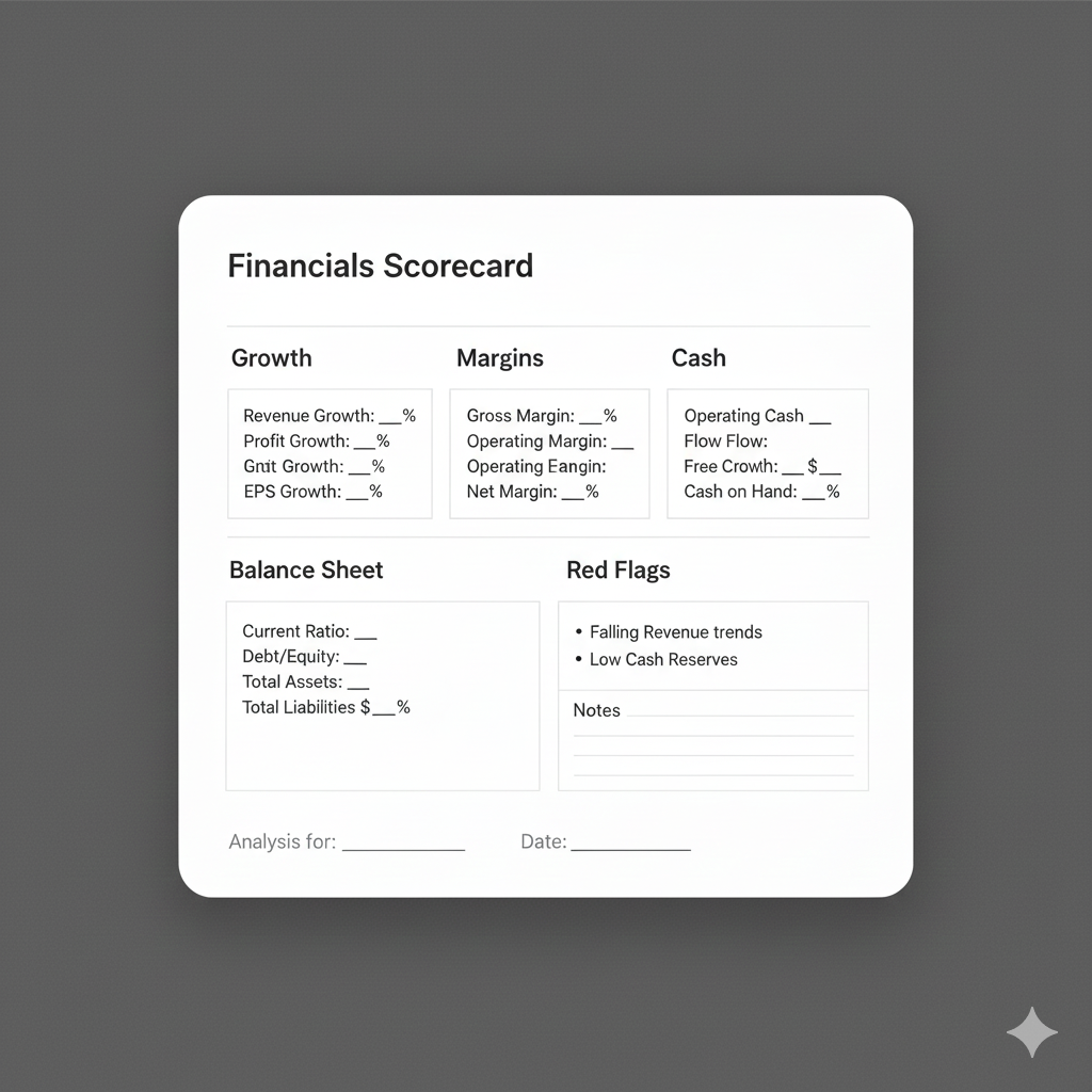 Write: revenue trend, margin trend, cash flow trend, debt trend, and any major red flags. Add one line about valuation only after you trust the quality.