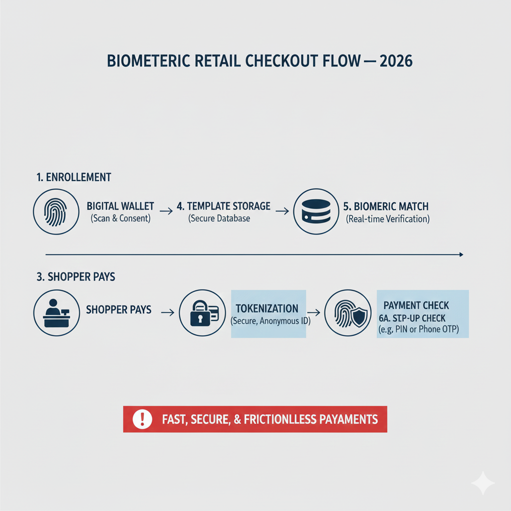 A customer enrolls once. Their biometric template is captured. The template is stored in a secure form, ideally on-device or in hardened infrastructure. When the customer pays, the terminal captures a new scan and compares it to the enrolled template. If it matches, the payment is approved.